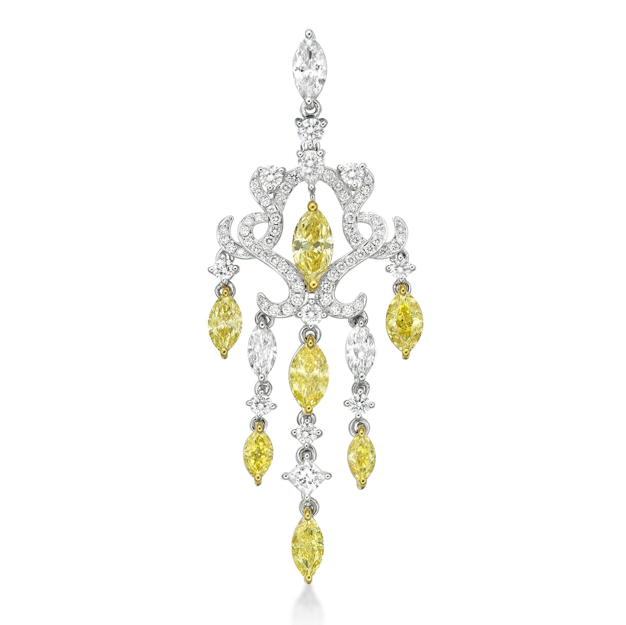 Our impressive pendant features white and yellow diamonds that are set in a vintage chandelier style with dangling rows of diamonds in 18K white and yellow gold. The pendant measures 2 1/4″ long