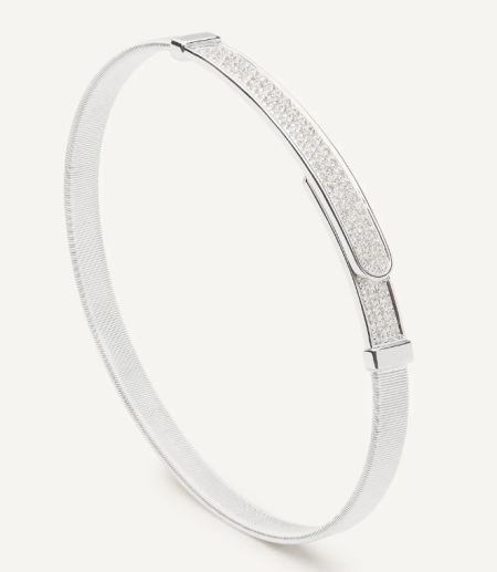 Sophisticated and linear in design, our bangle in 18K white gold is carefully handcrafted with Marco Bicego’s exclusive coil technique and embellished with diamond pavé to add a dazzling touch of radiance to the wrist. Perfect on its own and stunning stacked with the other bangles in the Masai collection, it is super easy to slip on and off thanks to the new integrated clasp.