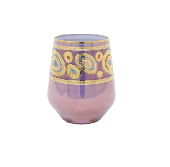 Ornate emblems and decorations that are indicative of royalty inspired this unique drinkware collection. The Regalia Purple Stemless Wine Glass is handpainted in 14-karat gold.